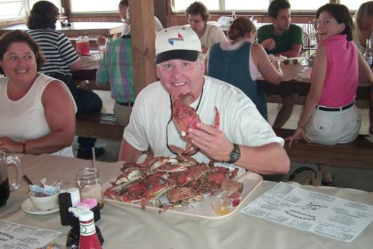 Yours truly chugging down a cold one. Unfortunately, you can't see that my shirt is covered with different colored crabs...