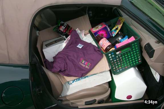 Rachel had arranged a bunch of goodies for the groups meeting in Harrisburg, including these cool Shag Mags, which were in the shape of the Yellow Submarine from the Beatles movie of the 1960s. I decided to add to that, and had T shirts embroidered with the words "Shagadelic Convoy: 1999) in multicolored letters. If you look closely in the first pic, you'll see one.
