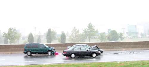 At one point, we had to make a determination as to which way to go - straight north to the western side of Pennsylvania, or northeast to Washington DC and up Route 95. Right where we had to make a decision, the rain picked up, and we pulled off the road for gas and to check the local weather. We got off just in time, as there was an accident right after our exit. There was a Fnord Explorer just past these vehicles, and its front end was badly damaged. Whew - we got off lucky!