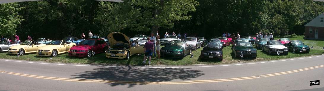 We parked across the street from the showroom, and they had a great barbecue set up for us. Here's all of us, parked, which was the first taste of things to come.