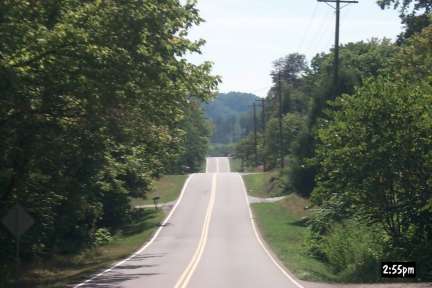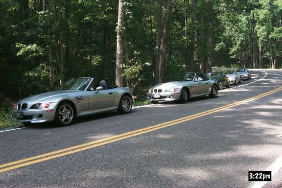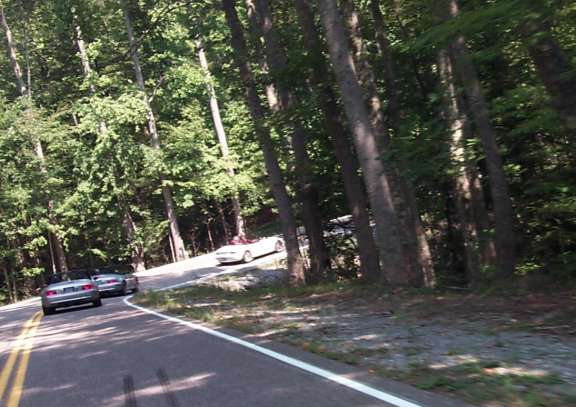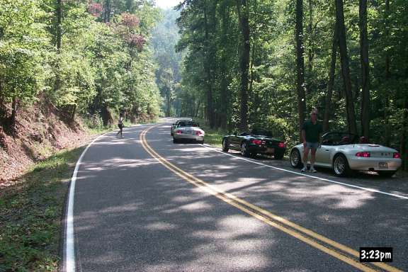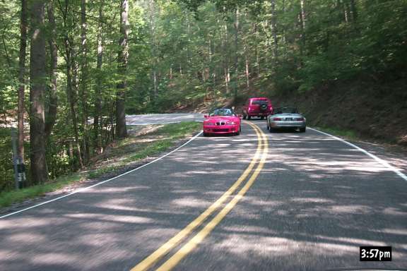 Considering that it would probably be our only opportunity to ride this road for a year (the next homecoming), coupled with the fact that I didn't get enough pictures the first time through, we went back up it. On the way back, we ran across the last of the people coming from Nashville. (The oncoming Z3 is red, but thanks to a bug in my camera, it comes out looking like Magenta).