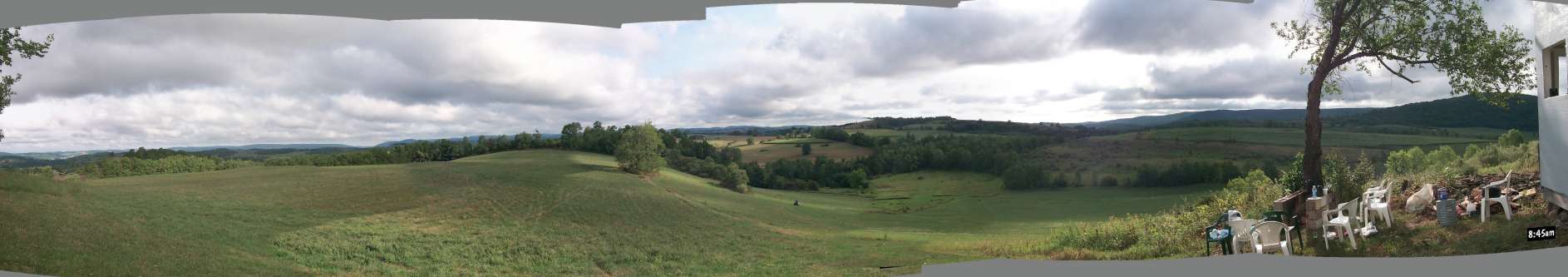 The next morning I snapped a bunch of pix and fed 'em into a program that digests 'em and makes a panoramic photo. Here is the view from The Baity Cabin: