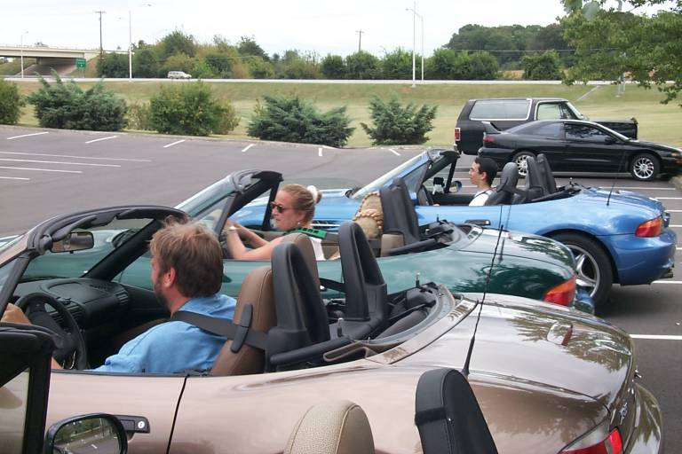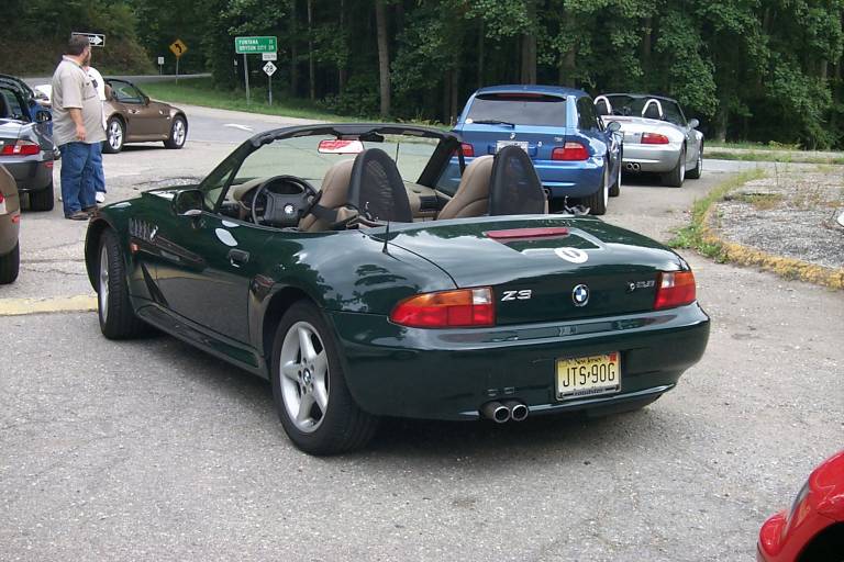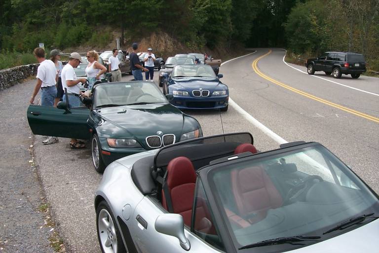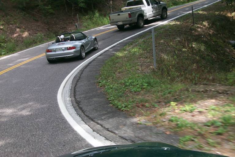 There was a little bit of jockeying around, and there was a hint that the rain was coming from the southeast. We were pretty lucky in that it did not rain while we were riding The Dragon, but there was evidence that it had rained shortly before our arrival as some patches of the road were still damp. So, we dove in, and kept running until we got to the scenic overlook. At this point, we all happily snapped pictures - I began thinking there were more cameras than roadsters some time around then. Robert had managed to attach a video camera between his roll hoops (I want the mount!), and offered to drive ahead and get all of us on tape as we passed him. Rachel gave him her video camera as well, so he was set. Then, I offered to stay behind, and get everyone on tape as they took off from the overlook. (Video to follow!). I happily shot away, and realized I couldn't keep a camera still to save my life, but more importantly, I heard the Supersprint exhausts of John B's and Bryan's 2.8 Z3s. It was right then and there that I realized I wanted one, and I'd get one when I could. Of course, I have to decide if I want the straight exhaust tips, or the DTM tips, which are curved upwards.