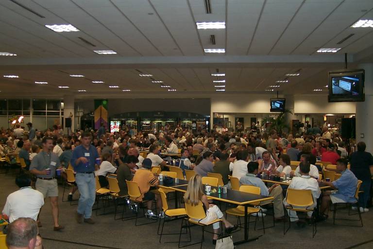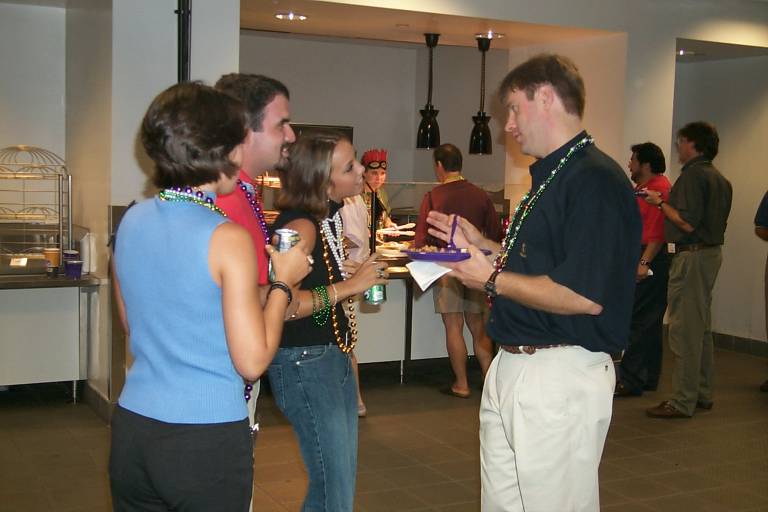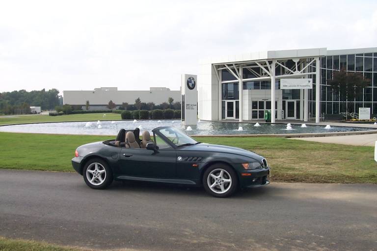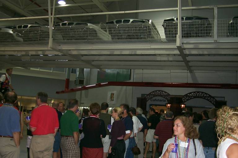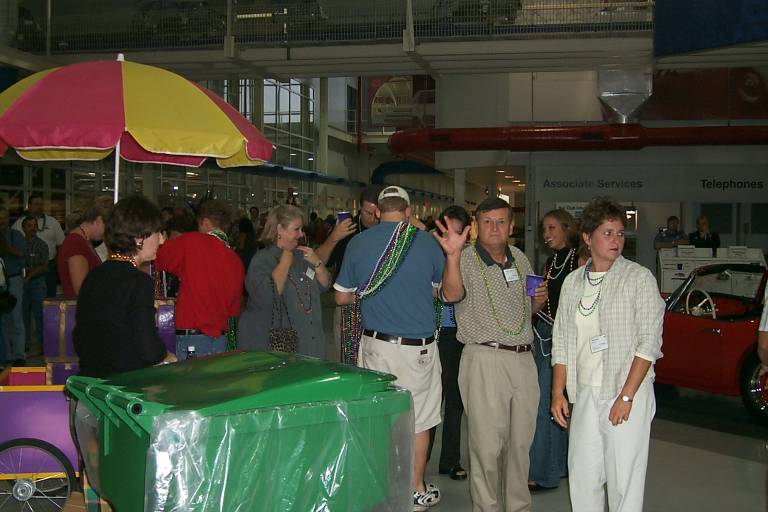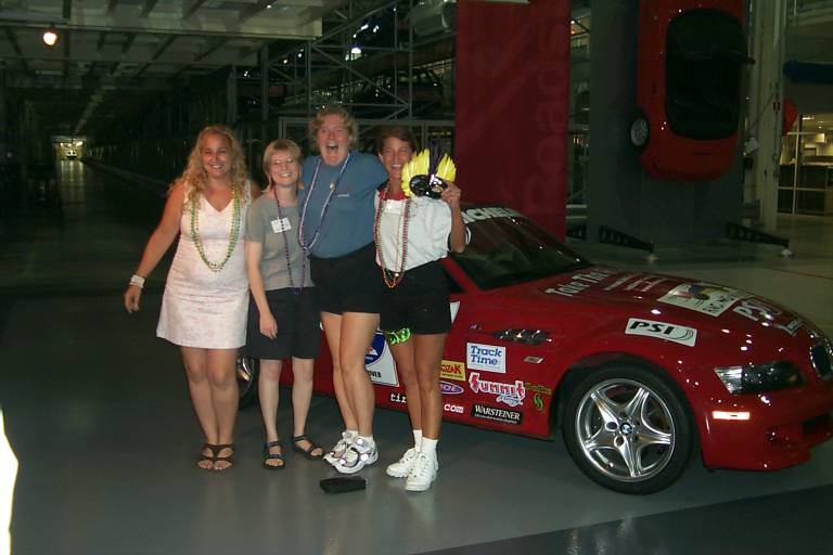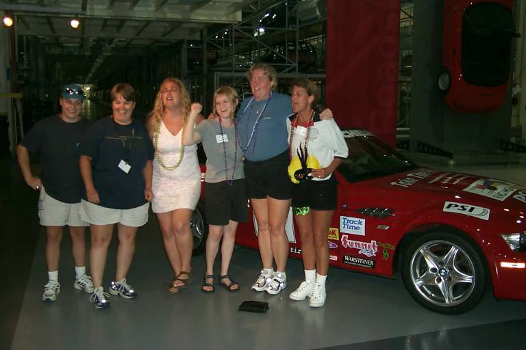 That night, we were to have dinner at the factory cafeteria, served outside. Being the weather was iffy, they shifted it inside. No biggie. The theme was Cajun, and we were given beads, ala Mardi Gras. Some of the BMW people got special necklaces with lobsters or crawfish. For this pic, a couple of Z3ers indicated the necklace, and asked "What do you have to do to get one of those?"