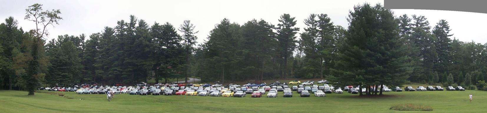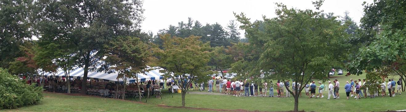 Just up the road was the Woodfield Inn, where everything was all ready for us. A lot of people had already arrived, but I found a nice cozy spot right at the end of the parking area. The cars looked very nice together, and we had a great vantage spot to sit and watch 'em while we ate. Ok, here's another panoramic shot. People seemed more concerned with their cars than with the long lunch line, and there's nothing wrong with that!