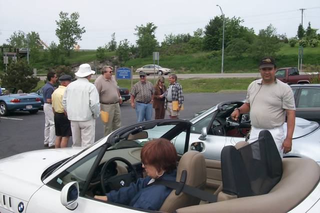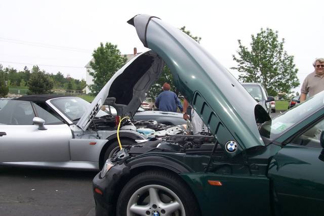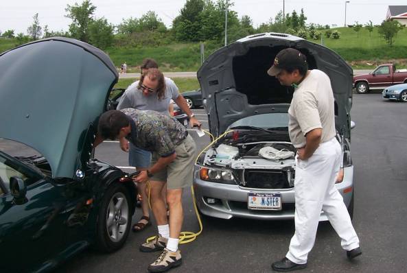 Some last minute assembly, and then we're off! Oh, wait a minute - it seems Howard left his aftermarket foglights on overnight, and his battery's dead. Rachel to the rescue - How bought jumper cables for her, and didn't get a set for himself.