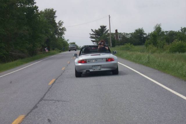 A couple of times Tracy pokes her head out of the car with a video camera attached.