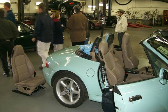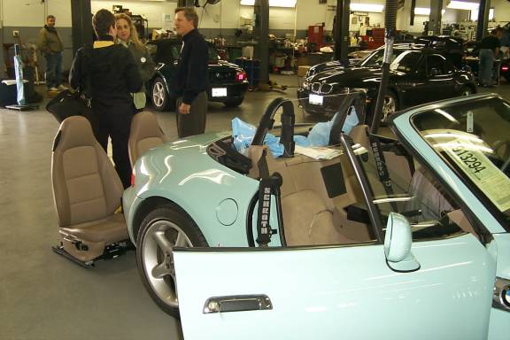 One of the more interesting things going on at Fixit Day was the Sport Seat/Standard Seat swap going on between Ann and Pat's Turquoise Z3 and Sean. Pat wanted regular seats, and Sean wanted her sport seat. This was a win-win situation, and it was easy for Daniels' to do. Mostly, it's just labor. I hear there was some minor leather work done when they were being removed, but I hear it was minor.