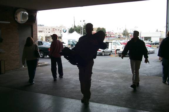 Sean's car was outside, and here's the tech bringing in the second seat after it was cleaned and pressed, as it were.