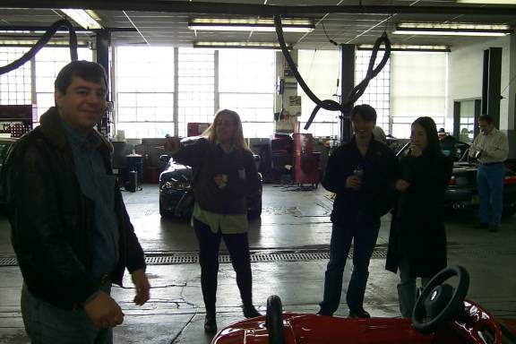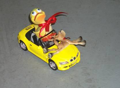 Bob and Sue Highfield had an early Z3, in Dark Green paint and a Beige interior. Unfortunately, while they were out traveling in the Midwest, they became the 'meat' in a tractor trailer sandwich (their words). Their baby was destroyed, but it gave its life to save theirs. Bob walked away from a complete wreck, and Sue had a minor concussion. While recovering in the Hospital, they both immediately decided to get another Z3, and selected a 2.3 in Dakar Yellow. Quite cool. They call their car Duckie (I believe), and got this little model of it. It has motion sensors that flash the lights when the alarm goes. what you see is a representation of something that happened a short time after getting their second Z3 - they had a run-in with a Deer. They did get lucky and found a great repair shop where their car was damaged. Judging from the car I saw, you could NOT tell it had been in an accident at all.