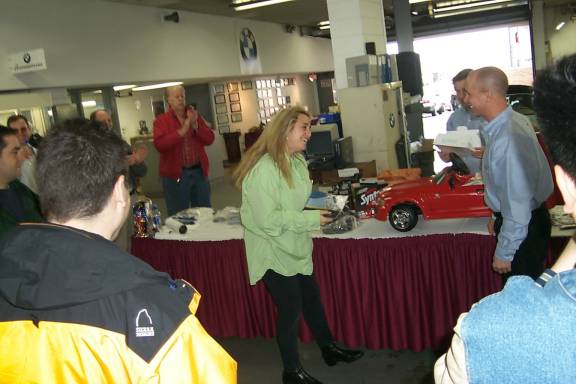 Daniels' raffled off some gifts - cases of oil, wash mitts, and so on. They gave Rachel a BMW scarf for her efforts to make Fixit Day a success.