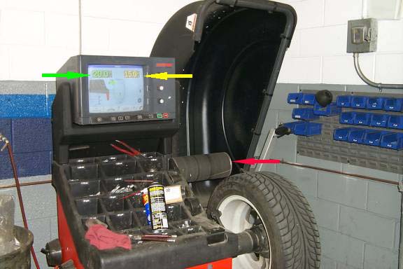 When I heard that Daniels had the Hunter brand tire machines, I was hopeful they could help. Below is a picture of the balancer.. The wheel's mounted, and the roller ( indicated by the red arrow) presses down on the wheel to spin it for the balancing process. So anyway, the roller does its thing, spinning the tire in both directions, and when its done, you get three readings. Two of the readings indicate where to put weights for balancing, and one to indicate if the wheel itself is bent. The green arrow indicates what weights to put on the inside of the tire, and the yellow indicates what weights (in grams) to put on the outside (behind the spokes). Unfortunately, you can't see the third reading. For it, any rating of 25 pounds or greater indicates the wheel is bent and needs repair. If you look closely, there's a red indicator on the screen saying where to put the weights. Pretty darn foolproof.