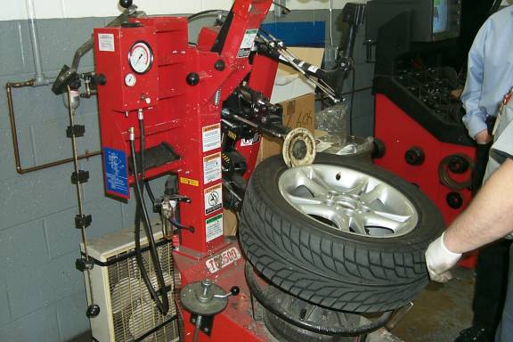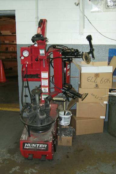 Here's the Hunter machine number 2, the tire removal device. Note the rubberized pads around the center spindle. They press against the wheel to keep it in place. Other tire machines I've seen have metal points that dig in to the wheel, not nice. Some of my Mille Miglia Spider wheels were likely mangled on those other machines, which I happened to see when they were being worked on. I didn't know any better then, but I do now!