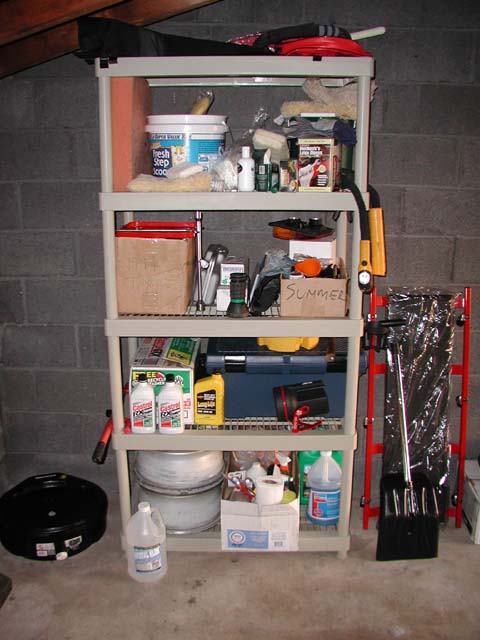 I even arranged things on it nicely, and in an order. Wheels, antifreeze, washer fluid and miscellaneous products on the bottom shelf (the most heavy), then the toolbox and oil next, then spare and replaced parts, then cleaning stuff, then the windscreen, jumper cables and other crap on top.