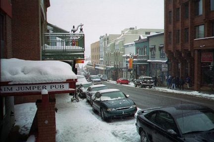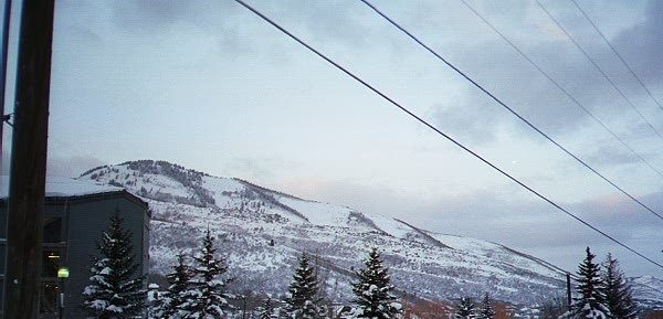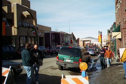 Here is a shot of Main street in Park City, which was always busy. Note the lack of snow. Note the film crew on the left. At first, I thought the man facing me was Jason Alexander, but it wasn't. |