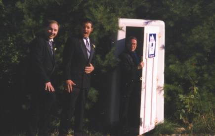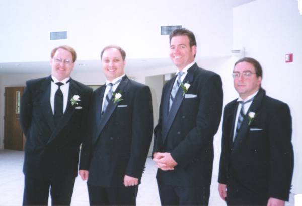The wedding itself went off without a hitch, pun intended. Seriously, everything went smoothly. Here are the groomsmen, and not an FBI photo of a crime family as you might suspect. Shown are G. Douglas La Cosa Whatstra?, his consiglieri only known as The Joker, Tom, aka Laughing Boy , and Johnny Are you talkin' to me?? Trudel