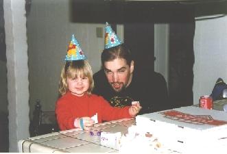 | While we were there, it was Lauren and Steve's daughter Sarah's first birthday. We had cake, of course, and I took more photos, but surprisingly, none of the ones of Sarah came out well. Anyway, here's Bill again, with Lauren and Steve's other daughter Monica | ![]() |